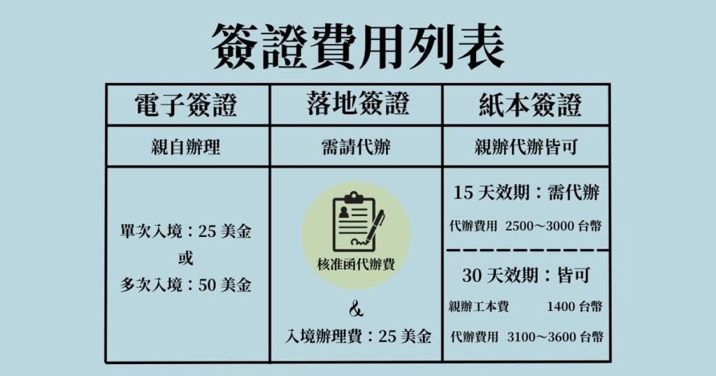 落地簽證的費用會包括批准函,和到機場後後換取正式簽證所需支付的費用, 30 天單次入境的落地簽證批准函,依據各家代辦機構收費不一定,最後在機場入境櫃台換簽時需要支付 25 美元。