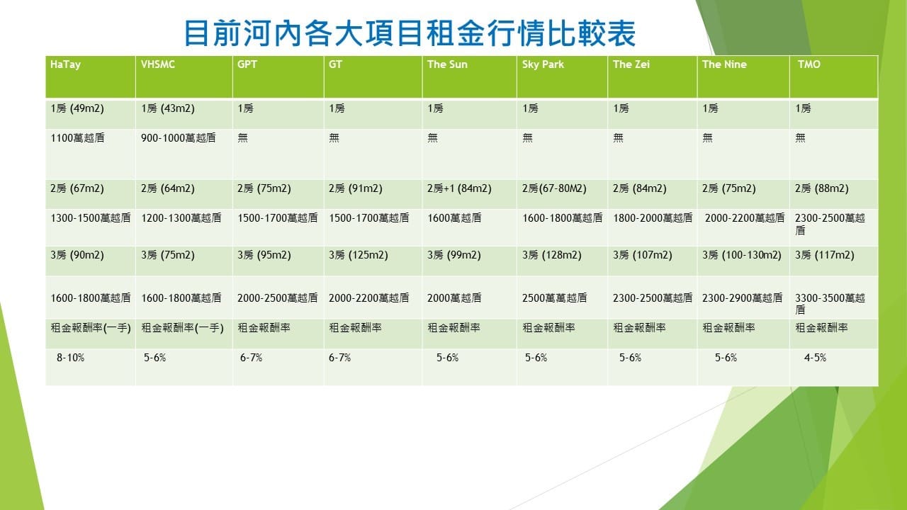 - 河內為越南首都,市場更穩定且受政府持續投資支持,仍具有長期增長的潛力。